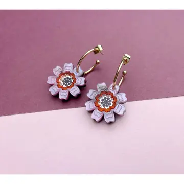The Agnes Daisy floral hoops: a lovely, eye-catching pair of hoop earrings that are easy to wear and style. The design is laser-cut and engraved from marbled acrylic. A hand-inked laser-engraved mirror acrylic centre is added, before being delicately assembled by hand onto a thin plywood base. The acrylic features intricate line engraving, which gives a luxurious feel to the design. Agnes Daisy Floral Hoop Earrings | Pink Marble Colourway The Agnes Daisy floral hoops: a lovely, eye-catching pair of hoop earrings that are easy to wear and style. The design is laser-cut and engraved from marbled acrylic. A hand-inked laser-engraved mirror acrylic centre is added, before being delicately assembled by hand onto a thin plywood base. The acrylic features intricate line engraving, which gives a luxurious feel to the design. The Pink Marble colourway features a beautiful pink marbled acrylic, with swirls of purple, darker and lighter pinks, and even the occasional flashes of black and yellow. The centre is made from rose gold mirror acrylic, with a bold orange frost frame. Dimensions: Flower size: 2.3cm x 2.3cm Hoop size: 2cm x 2cm The earring hoops are gold-plated brass and fasten with a butterfly.