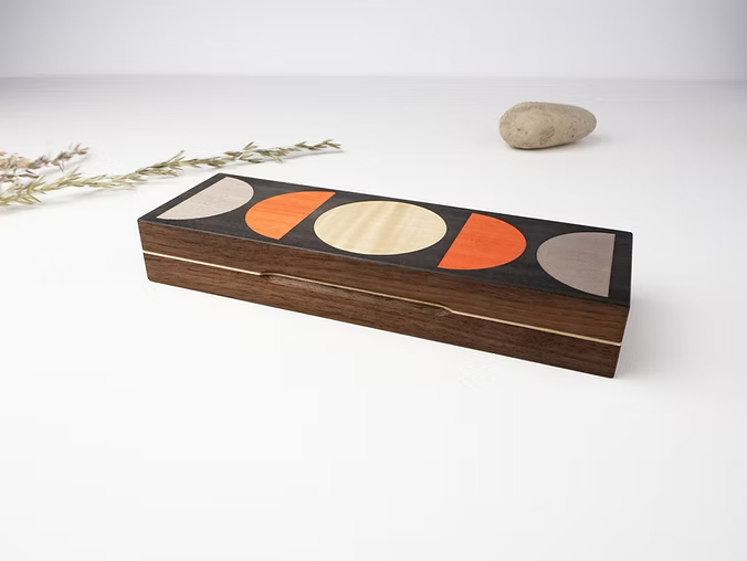 Our beautiful small jewellery box is made from sustainable solid walnut. The contemporary marquetry top uses a selection of hardwood veneers, with natural sycamore lining the inside surfaces. Solid brass inset barrel hinges and hidden magnets securely close the lid with a satisfying ‘snap’. The two compartments are lined with black velvet – one area can hold several small pieces of jewellery side by side and the circular space, is the perfect size to hold a special ring.