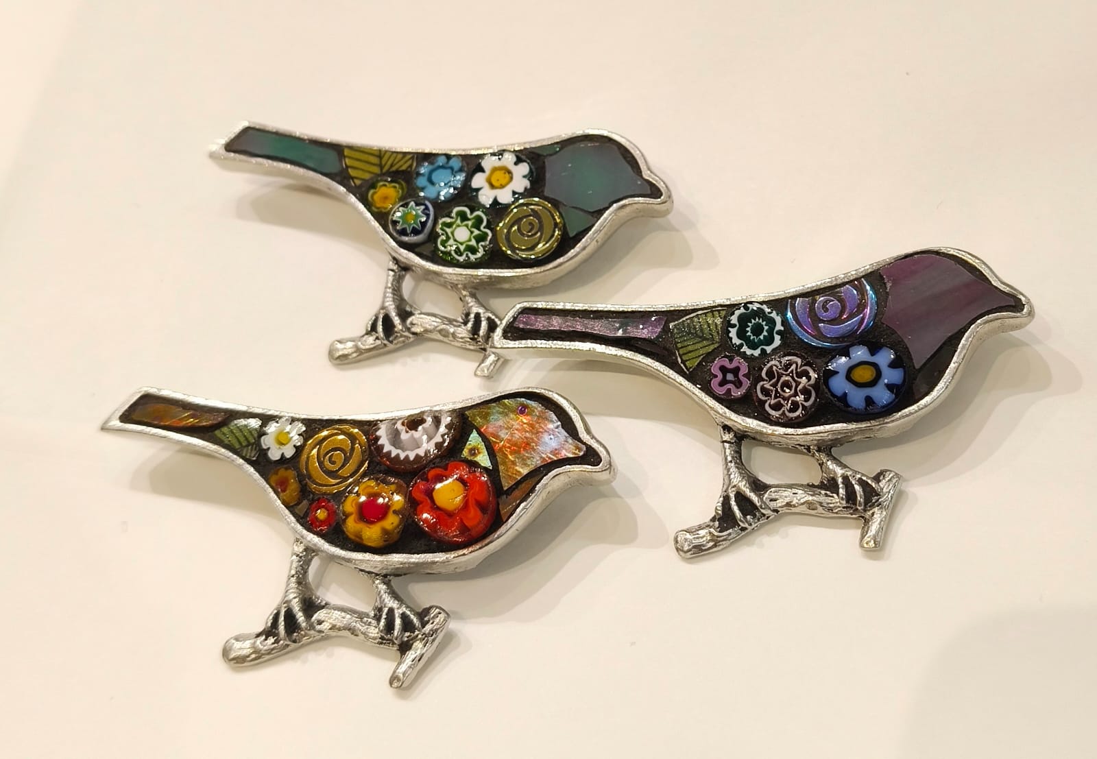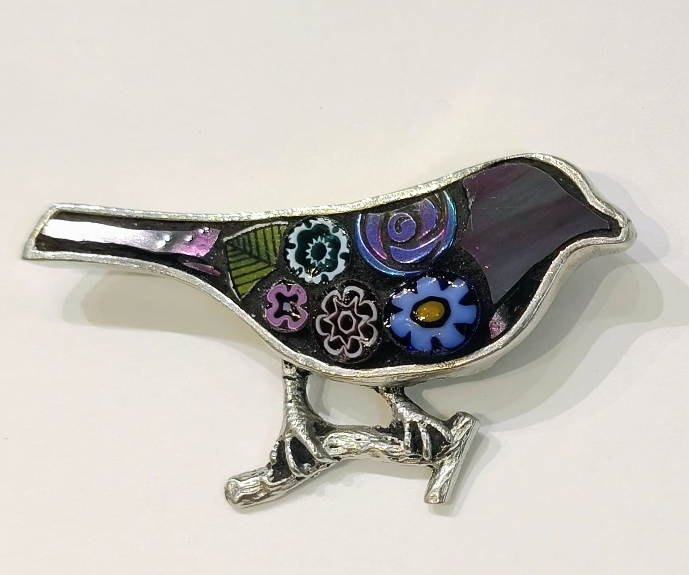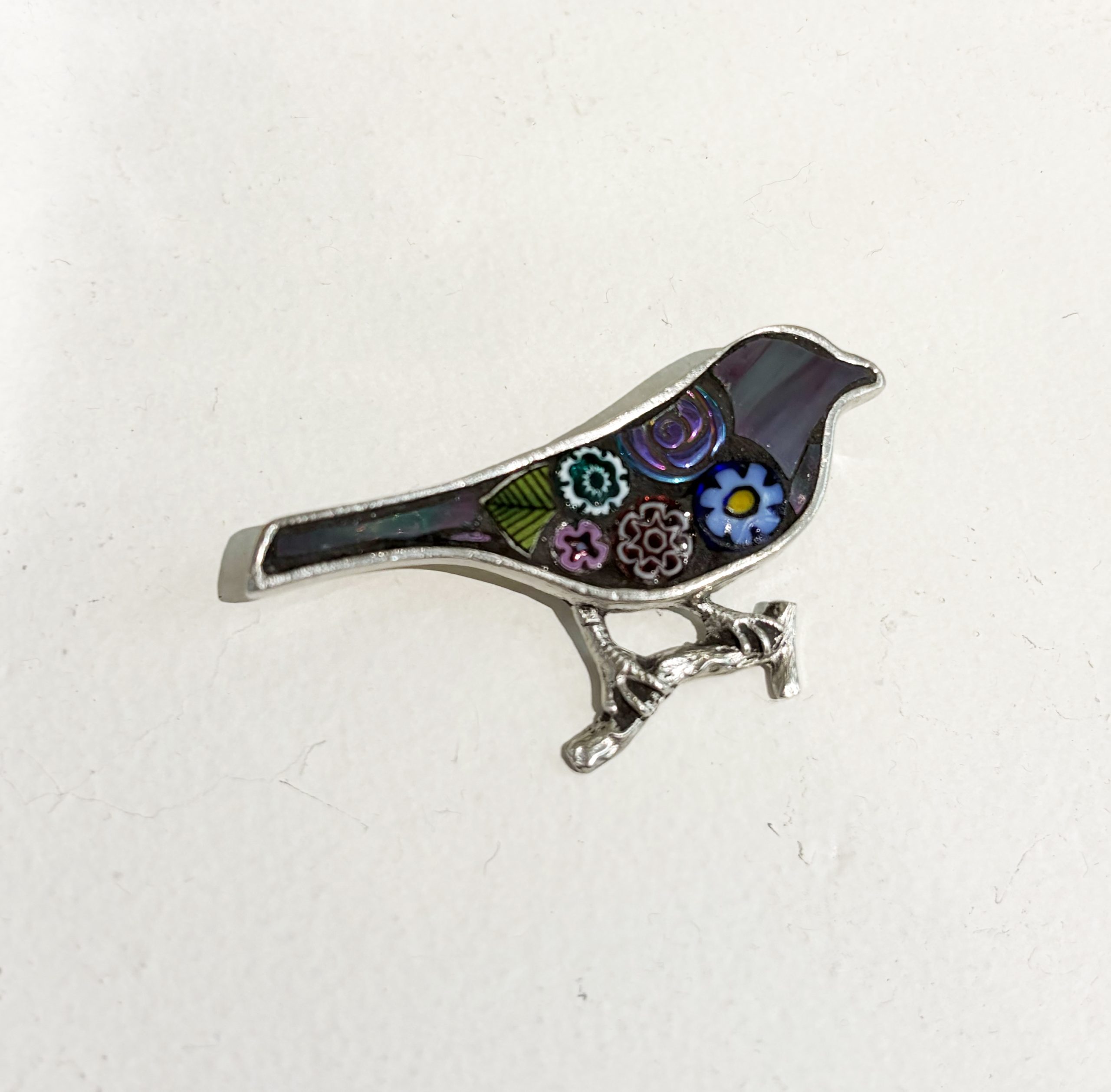 A beautiful mosaic bird brooch that is lightweight to wear on a spring jumper or a thick coat or jacket. These brooches make the perfect gift for anyone who loves nature and like wearing an unusual brooch that is sure to catch the sun and sparkle