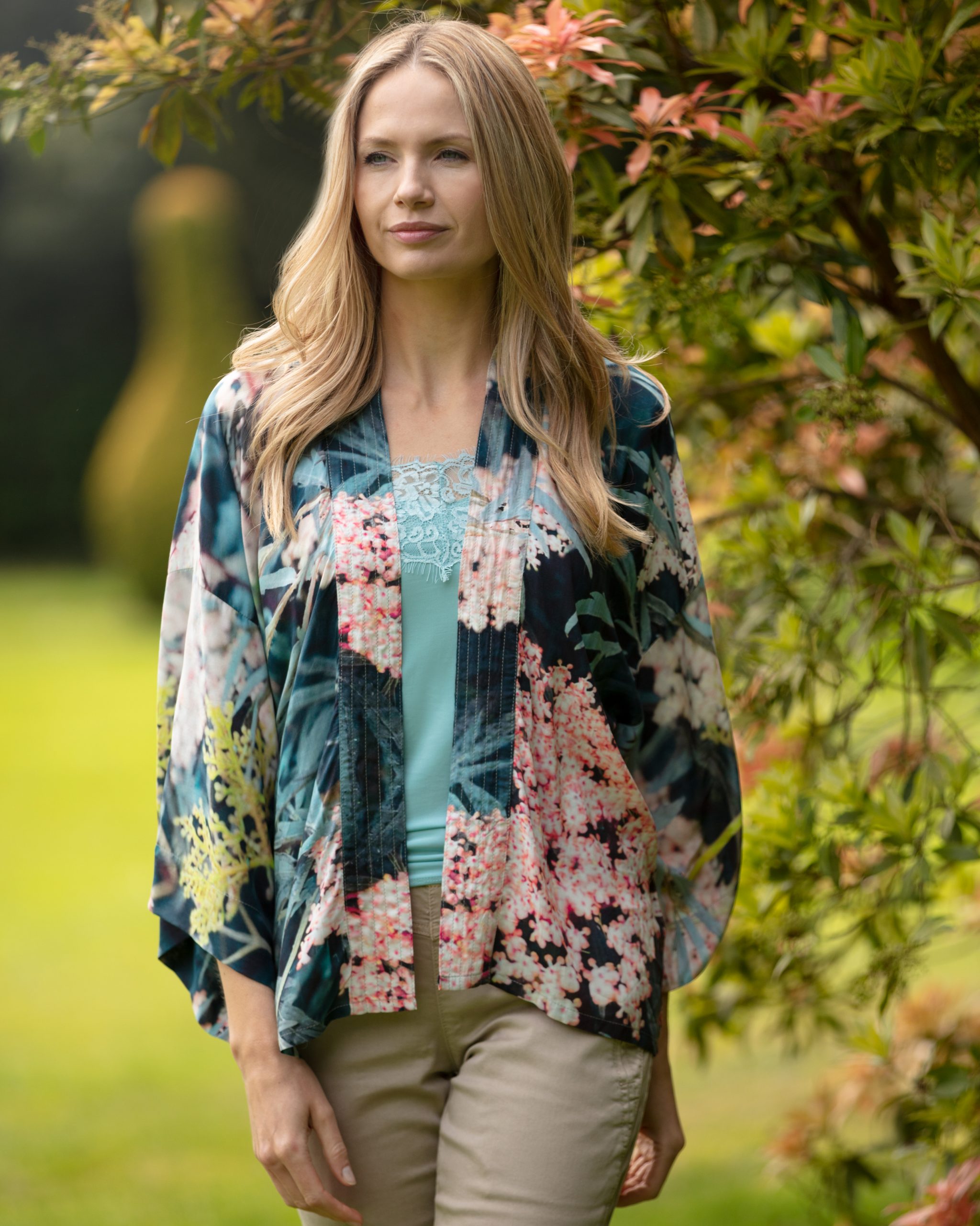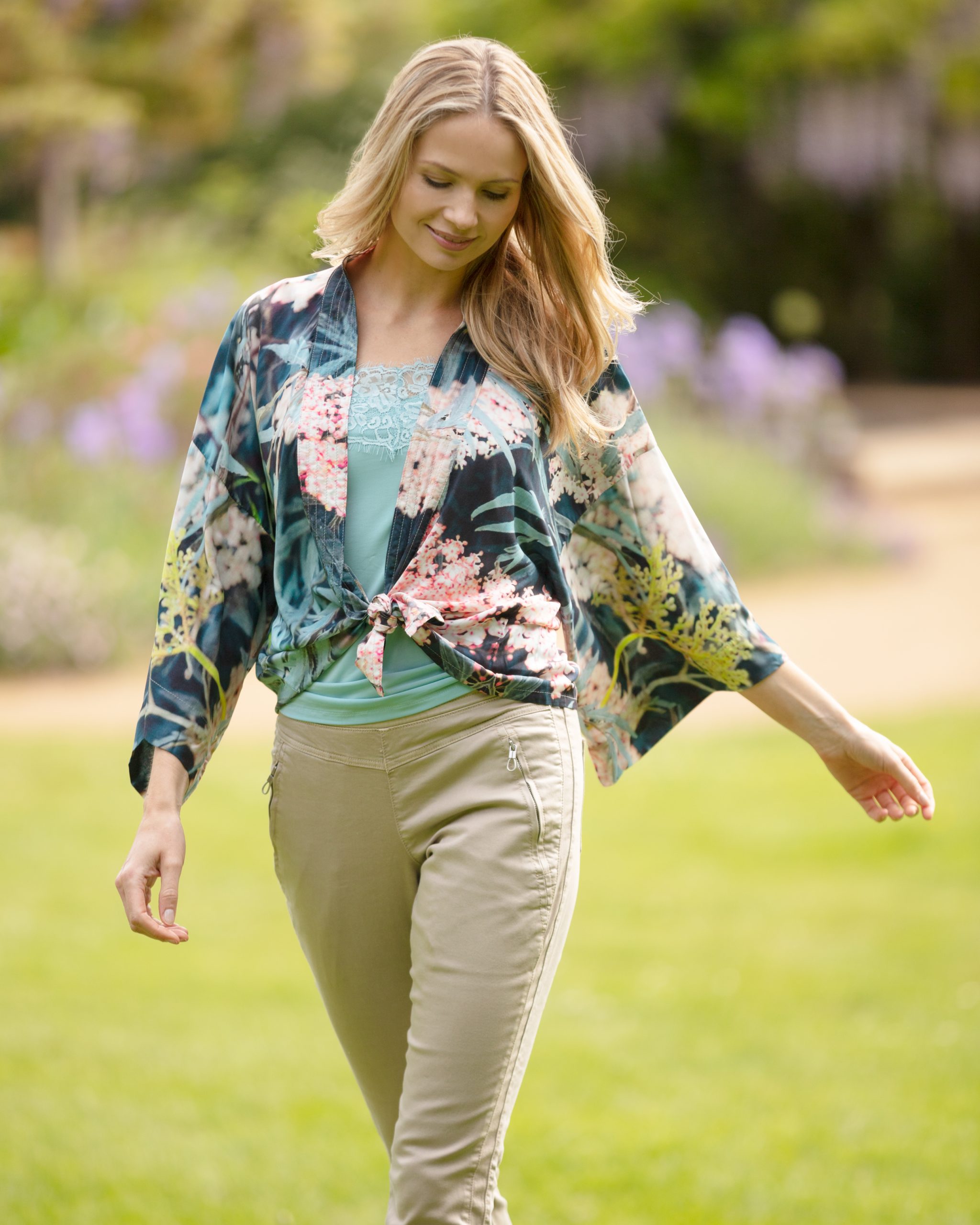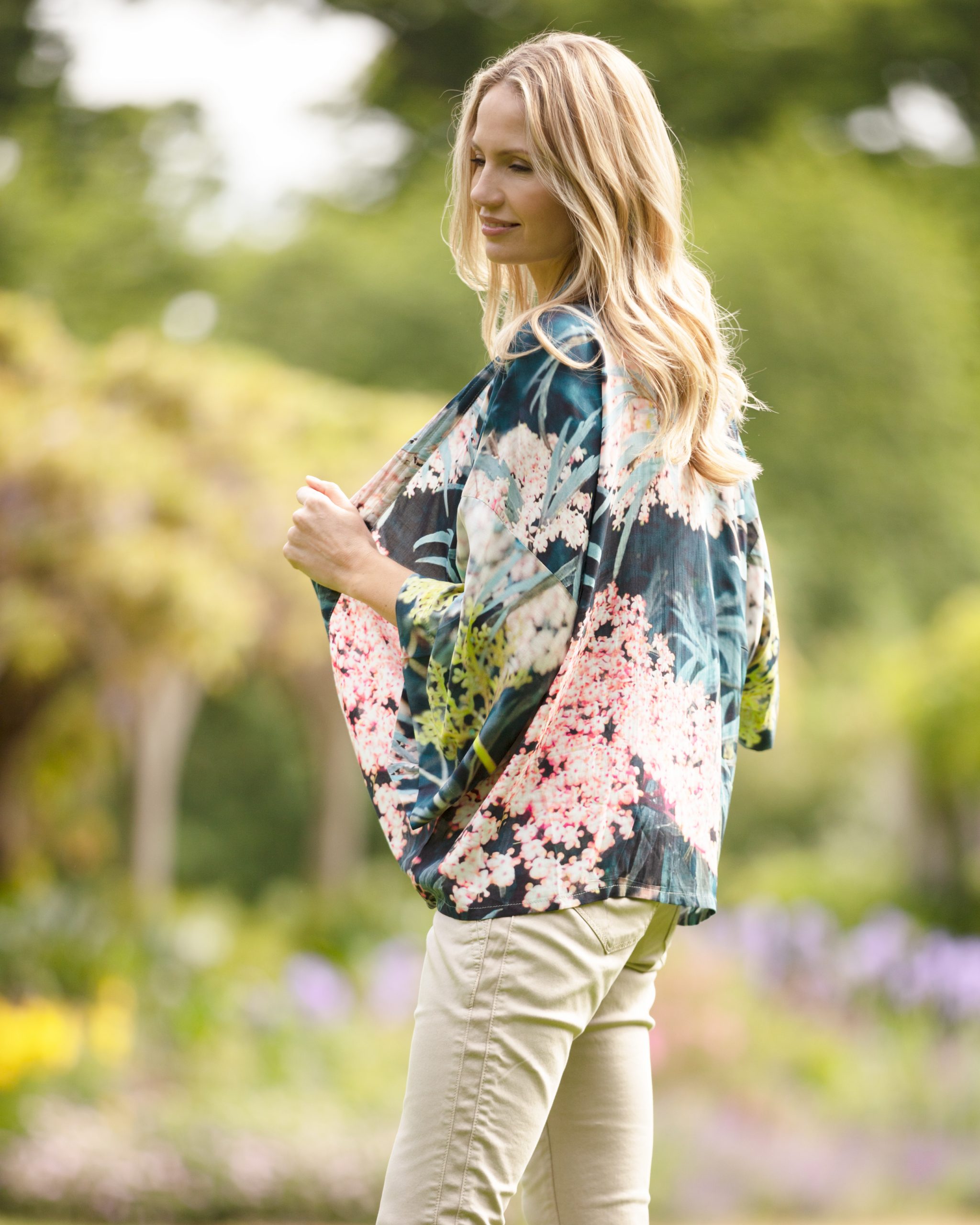t is made from a draping, silky smooth viscose fabric and has an exclusive Elderflower print in willow green, teal, blush pink and white. The print is sophisticated with lots of colours that can work beautifully alongside it.