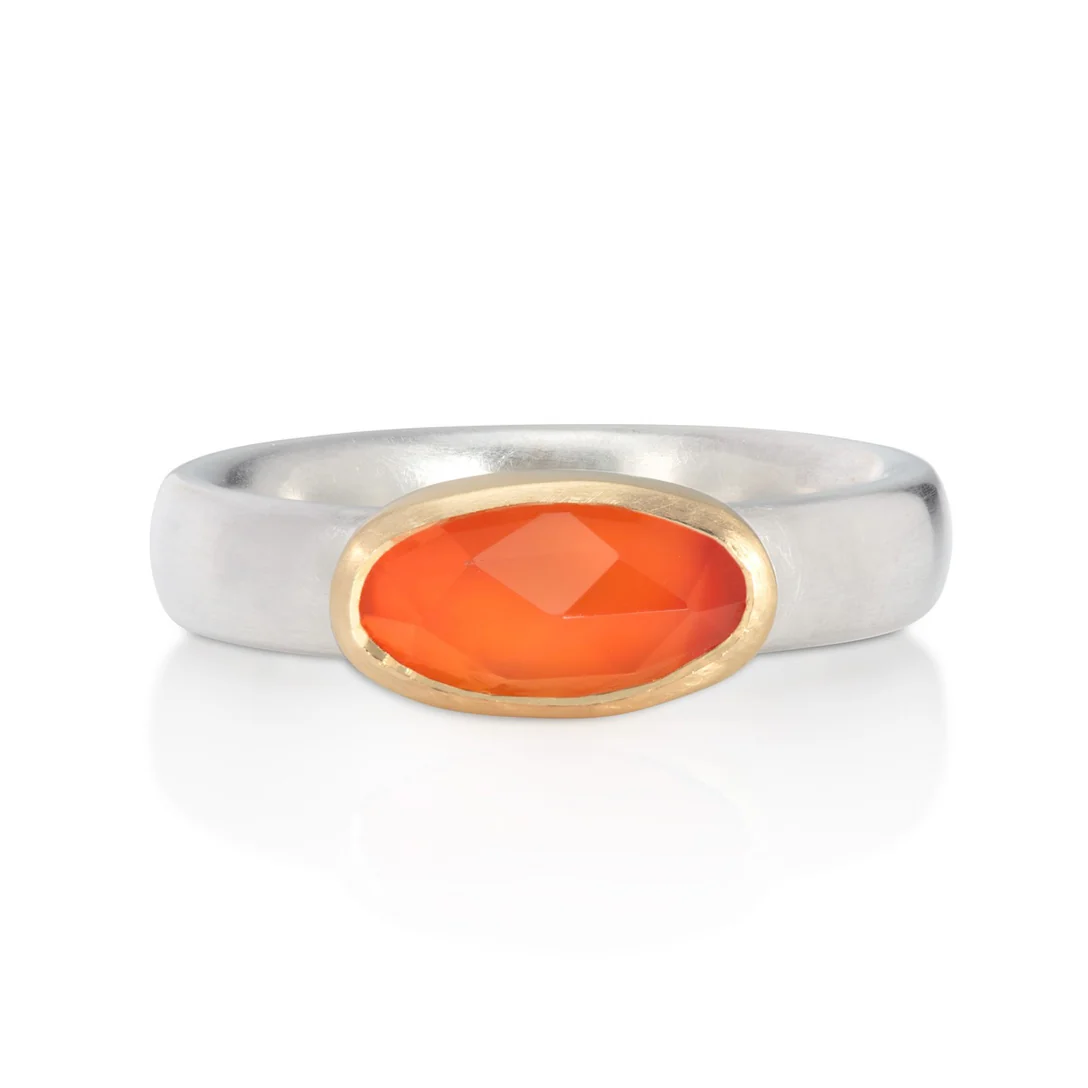 A vibrant orange carnelian 11x5mm oval set in 18ct gold with a silver base. The silver band is 4.2mm wide oval wire that is very comfortable on the finger.