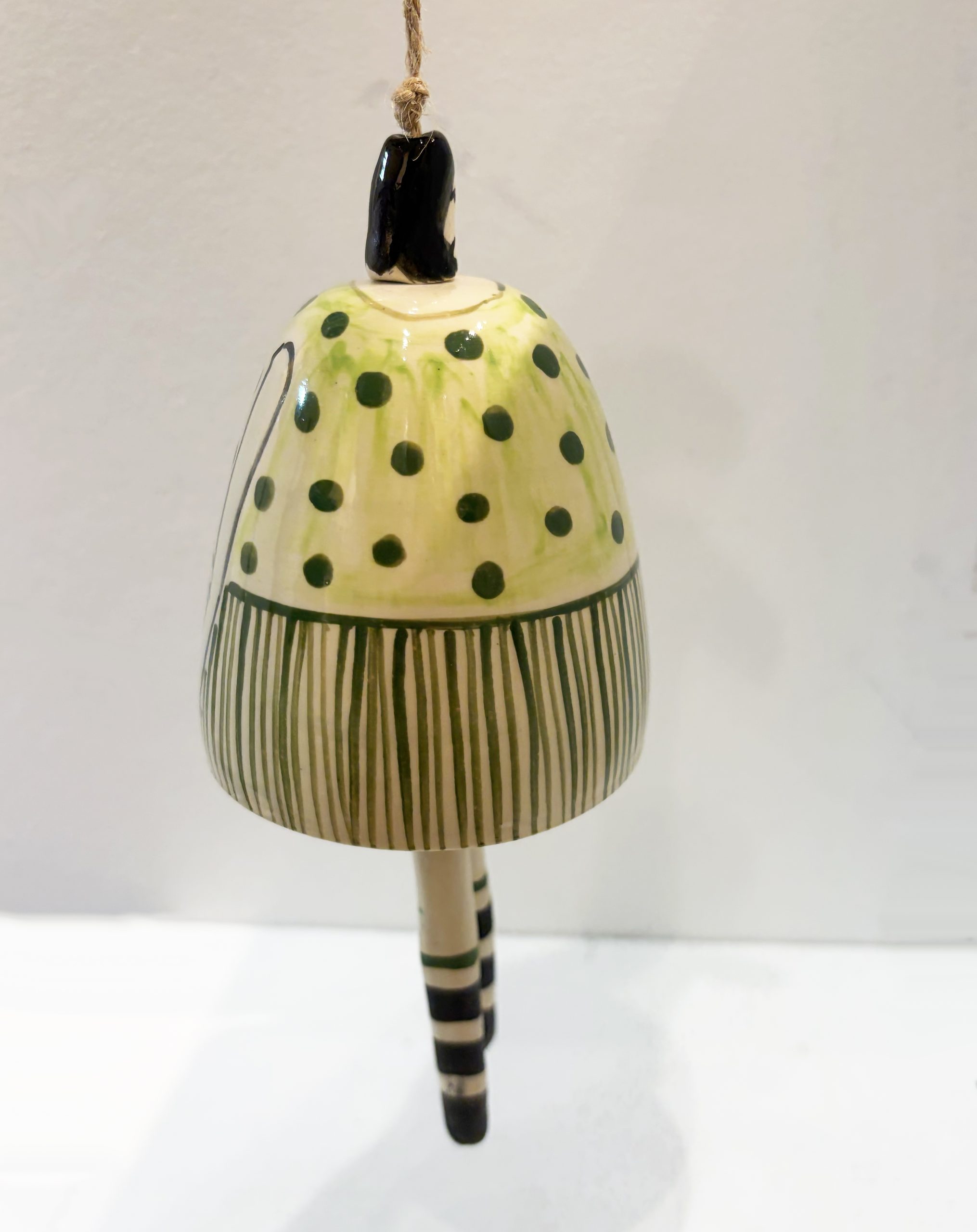 Wheel-thrown ceramic bell with the legs as the clappers under a hand painted body.