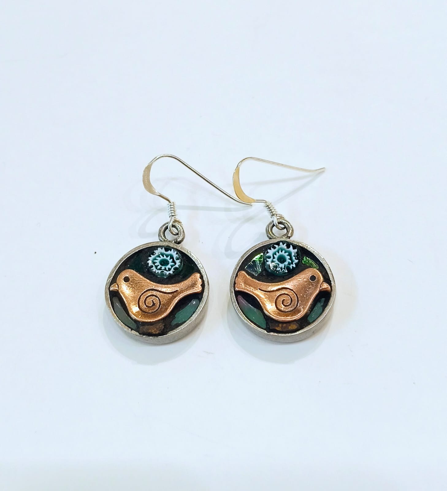 Why not add a pop of colour to your wardrobe with these circular bird earrings.