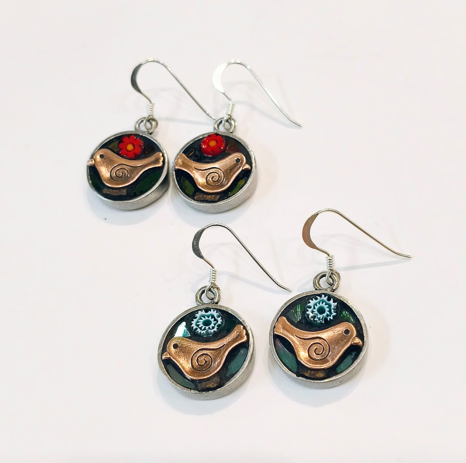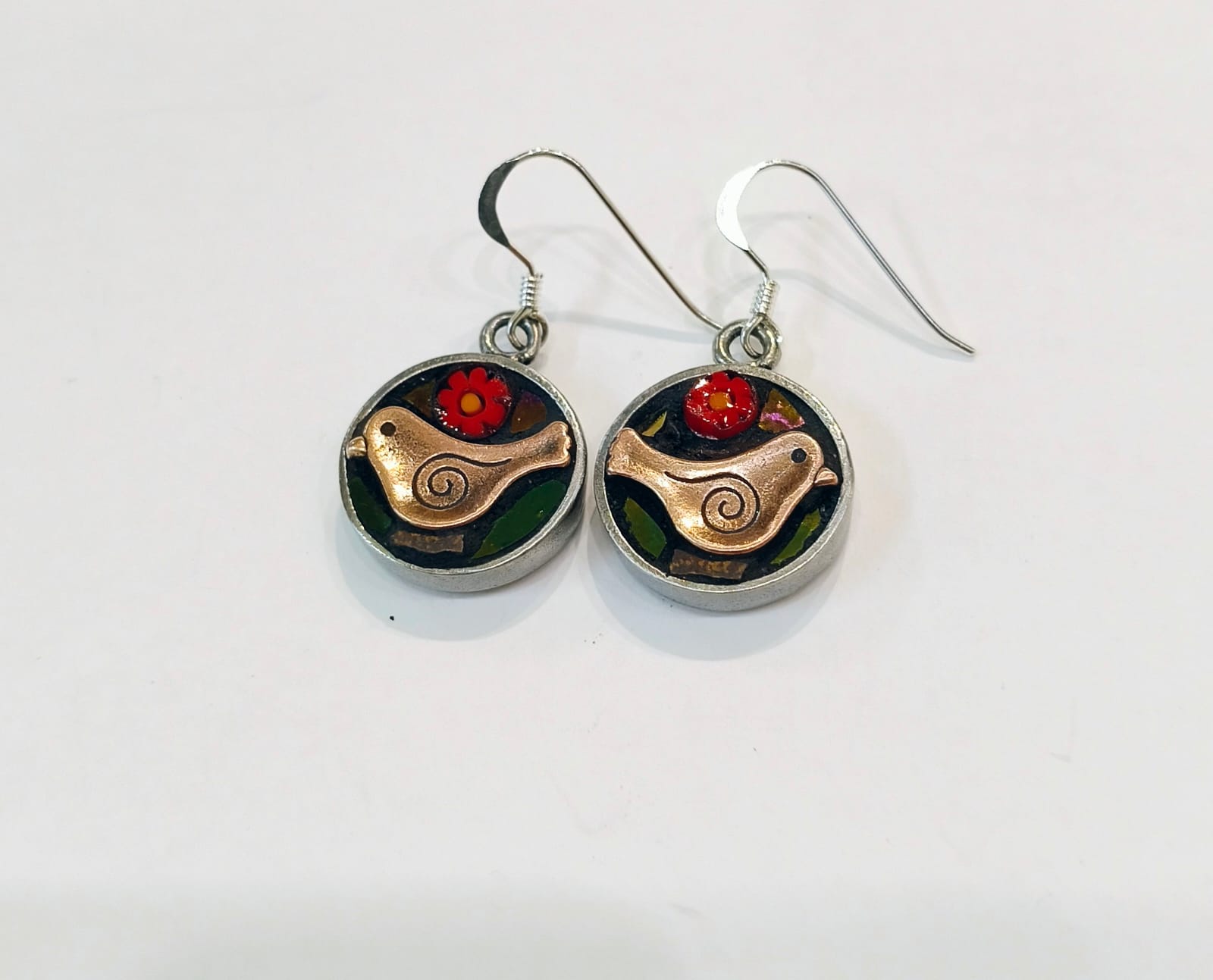 Why not add a pop of colour to your wardrobe with these circular bird earrings.