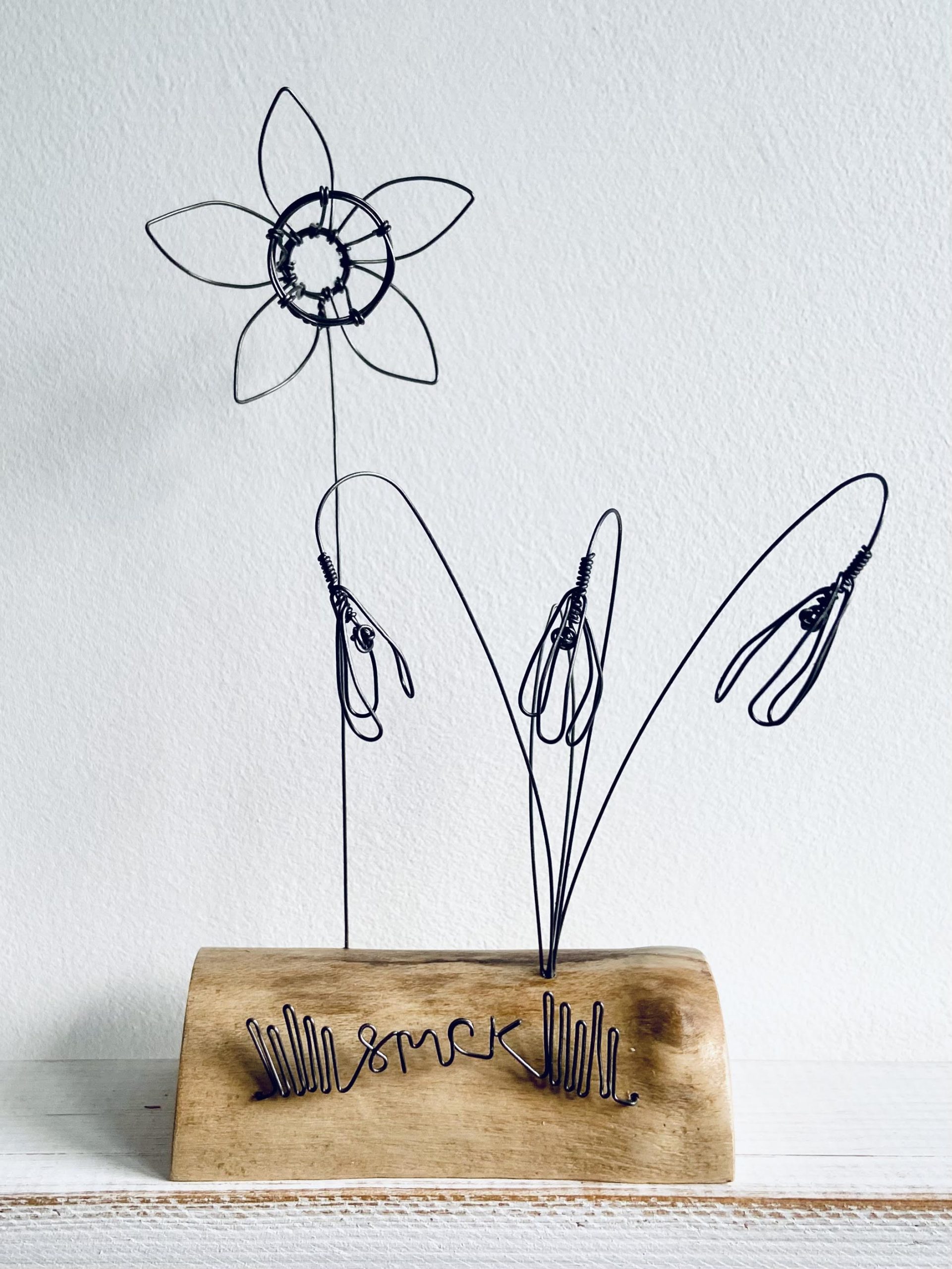 A lovely spring bouquet of a daffodil and three snowdrops, formed from black annealed wire and a beautiful piece of driftwood. The driftwood has been waxed.
