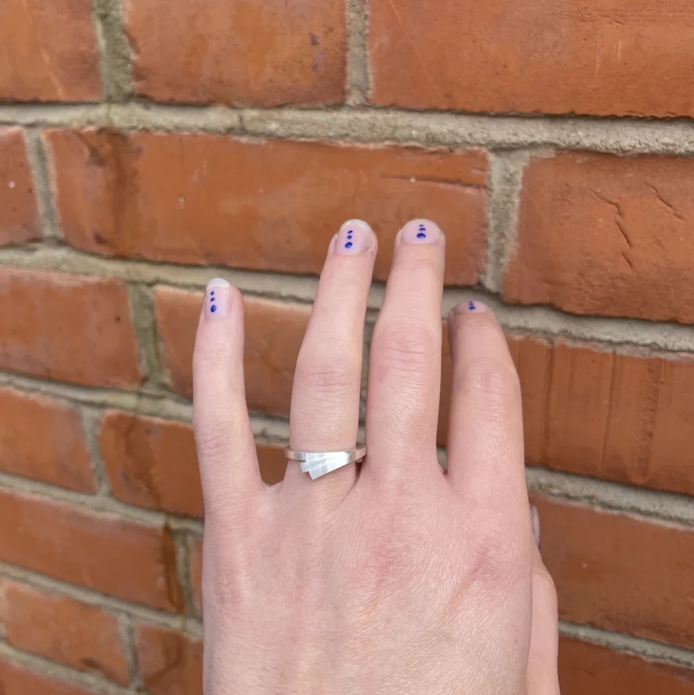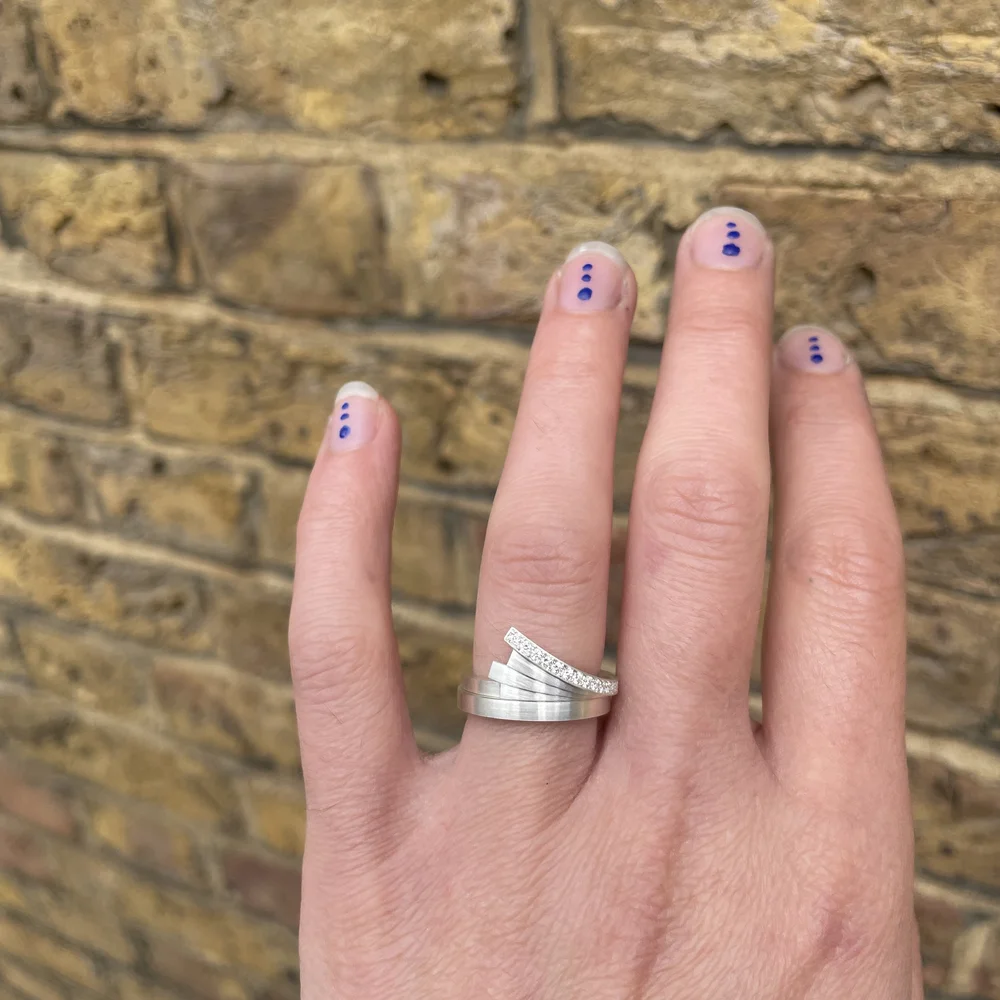 The elegantly simple stack is versatile. Pleasingly asymmetric when worn alone or stacked to create a real statement. The flat edge at the centre allows for easy wear with eternity bands and more traditional wedding rings. Making it the perfect alternative engagement ring/ unusual wedding ring set.