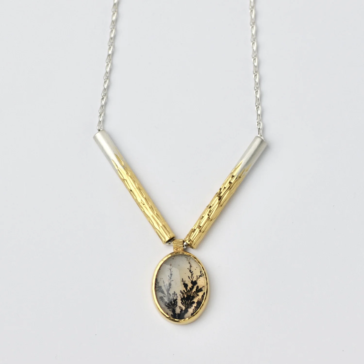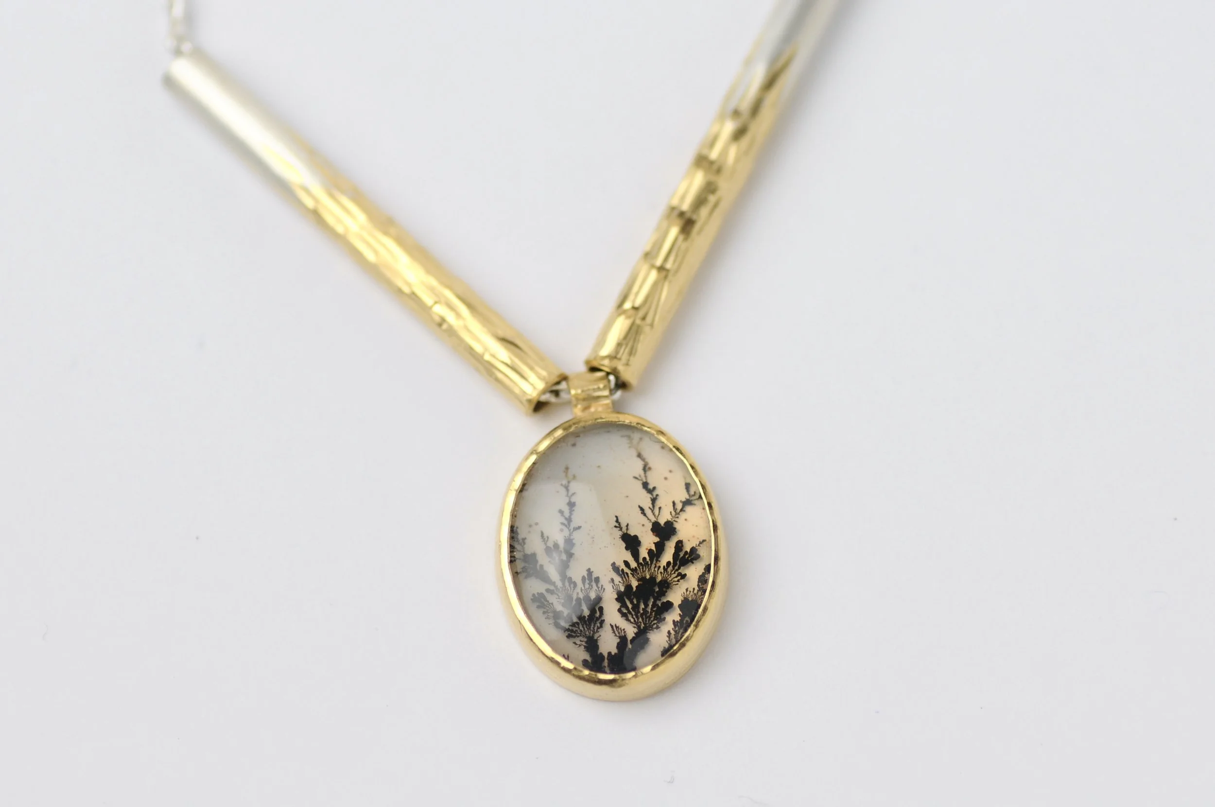 Flux necklace featuring an oval dendritic agate doublet with a mother of pearl backing as a pendant in between two hand engraved textured beads with a gold plated gradient. Pendant is also gold plated silver.