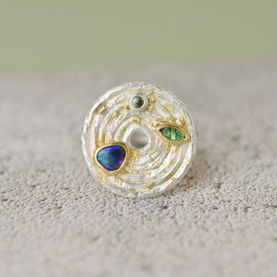 Flux Whirl ring, made from recycled sterling silver, 18ct gold solder and featuring a three beautiful stones all set in 18ct yellow gold