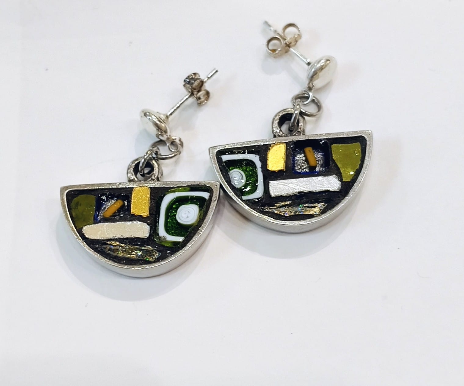 Why not add a pop of colour to your wardrobe with these half moon earrings. Inspired by gaudi. We love the mixture of mosaics Angela has used with a hint of gold sparkle. These earrings create a subtle impact and are very lightweight to wear.