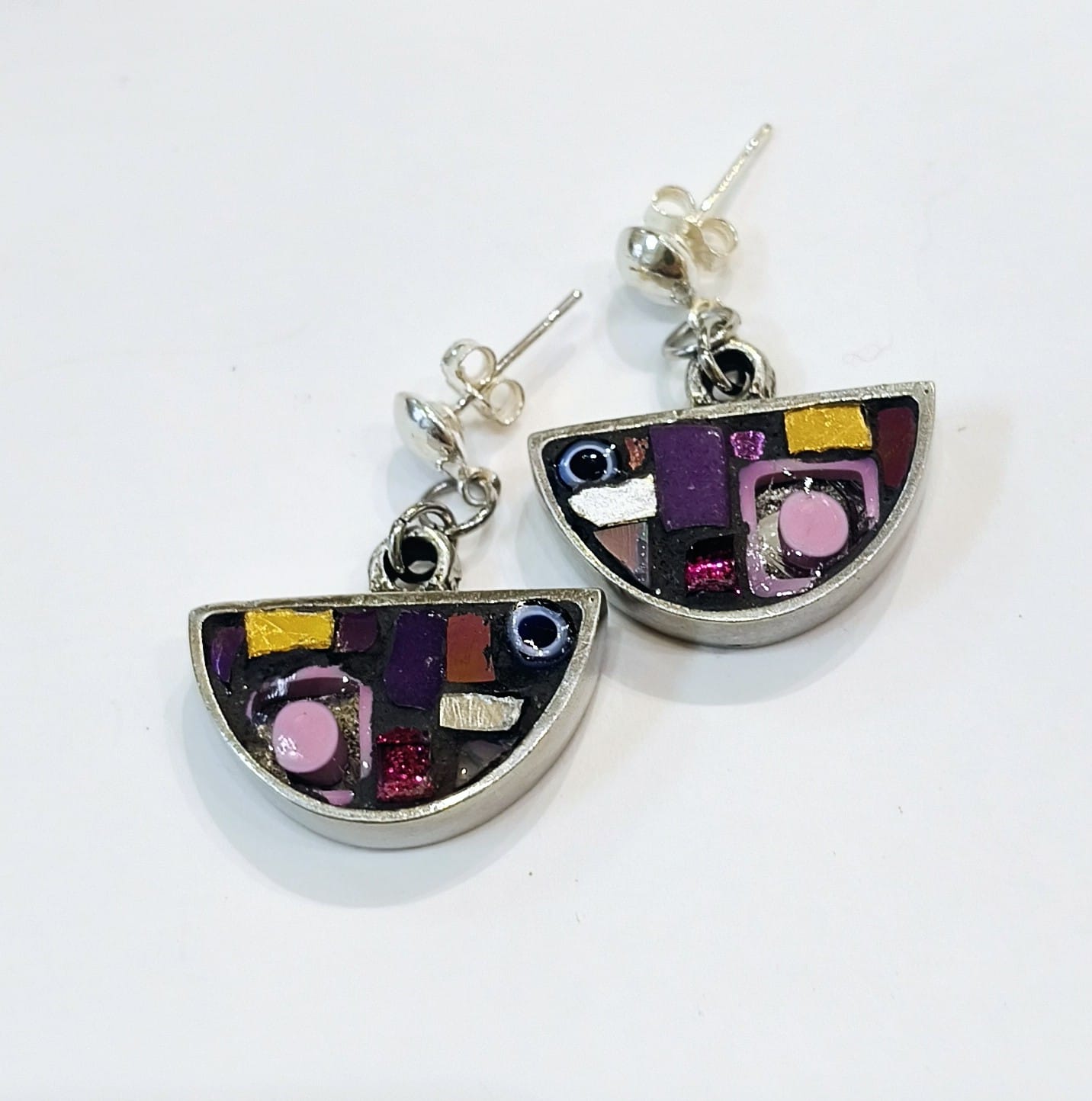 Why not add a pop of colour to your wardrobe with these half moon earrings. Inspired by gaudi. We love the mixture of mosaics Angela has used with a hint of gold sparkle. These earrings create a subtle impact and are very lightweight to wear.
