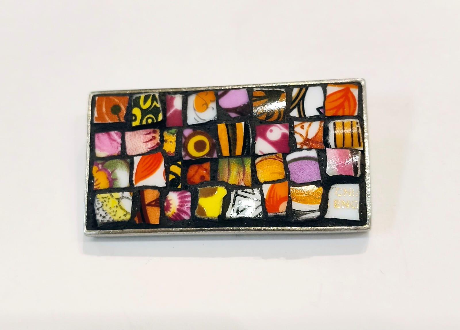 A beautiful oblong mosaic reminding me of Barcelona’s Gaudi garden. This brooch that is lightweight to wear on a spring jumper or a thick coat or jacket. These brooches make the perfect gift for anyone who is creative and like’s wearing an unusual brooch that is sure to catch the sun and sparkle