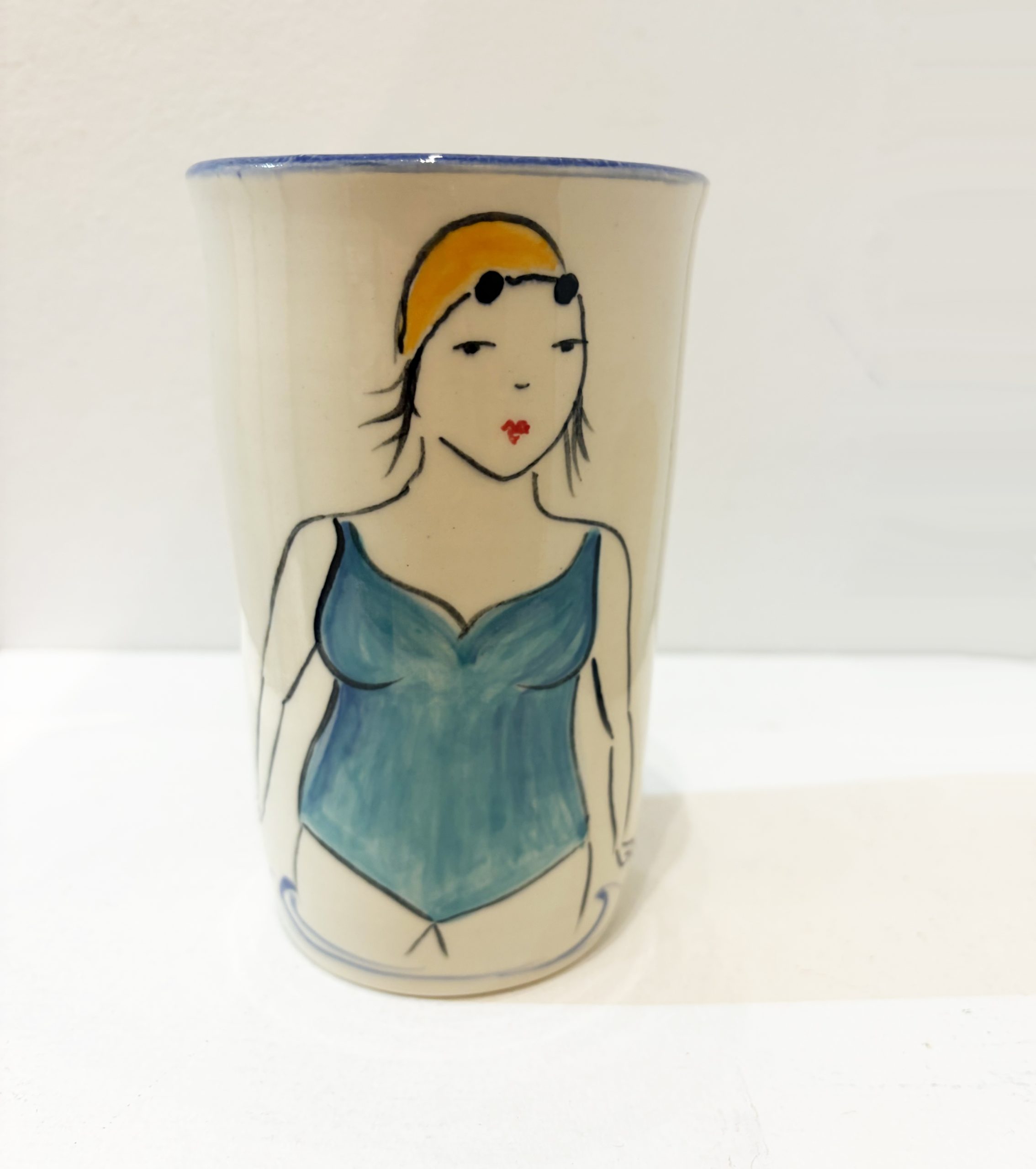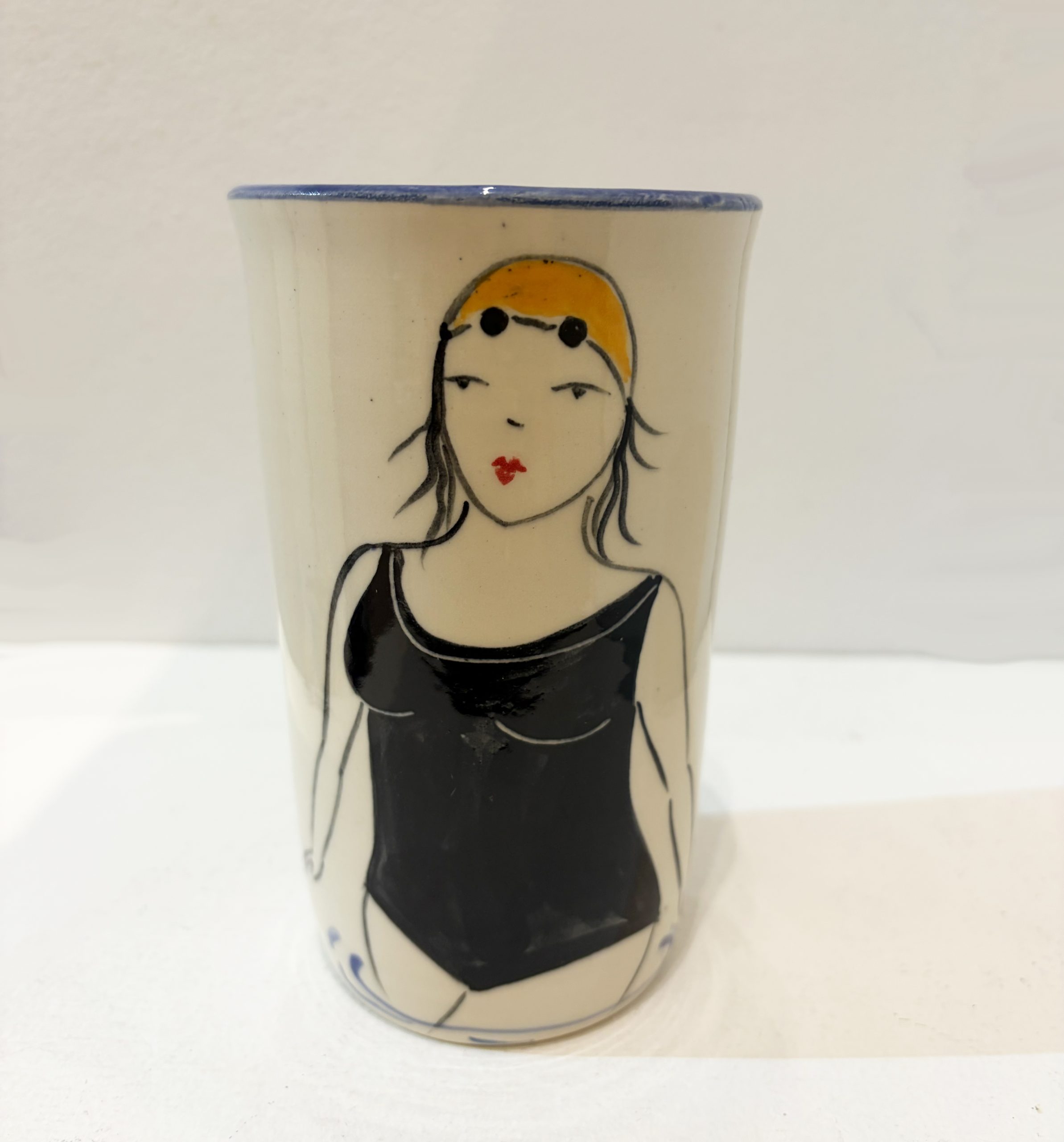 Wheel-thrown ceramic medium vase hand painted on the front with a vintage style illustration of lady in her swimming costume, swim cap and goggles. Individually decorated by Lucie in her Newlyn studio.