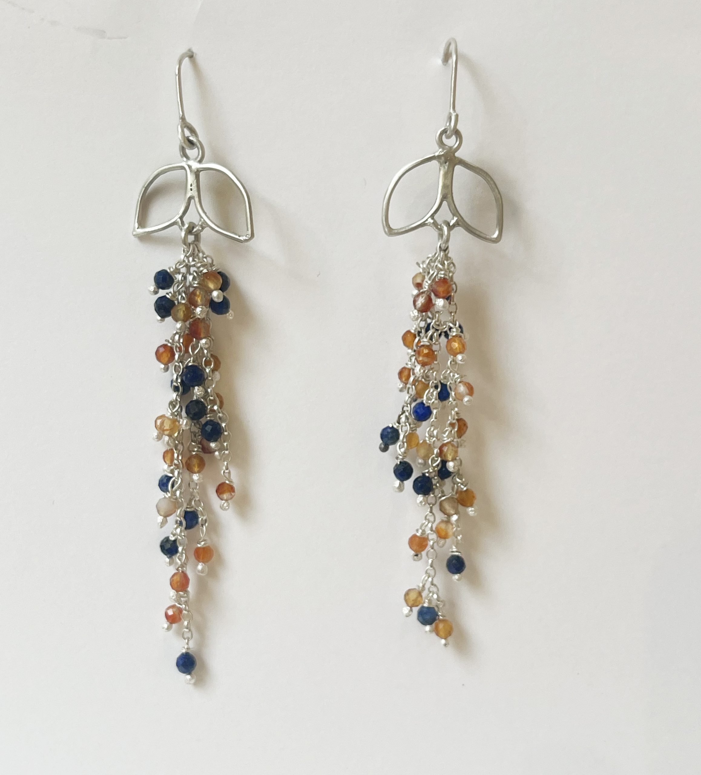 A statement pair of earrings from Emily’s leaf range with a striking cluster of carnelian and lapis lazuli beads draping down like a chandelier. The perfect earrings to wear everyday or for any special occasion.