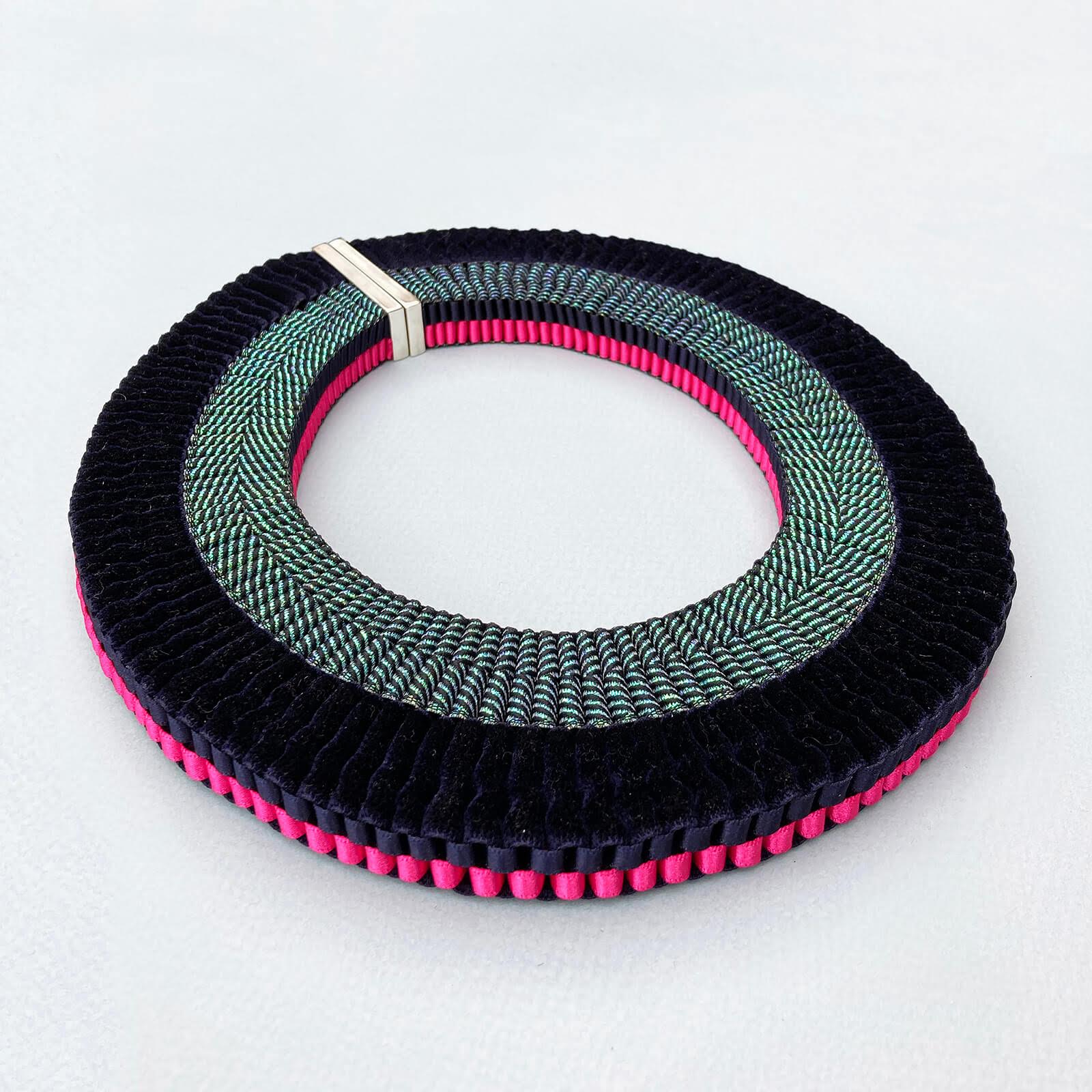 A beautifully crafted statement piece from an exclusive collection, combining vintage braids with contemporary colours and recycled silver. Sourced from across Europe, each piece is infused with its own unique history and reframed in a distinctive modern style. This collection consists of one-off treasures and limited edition design