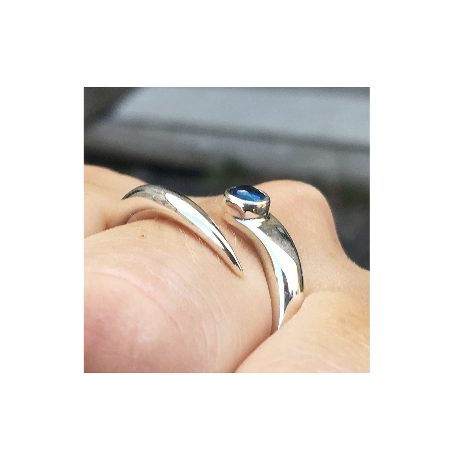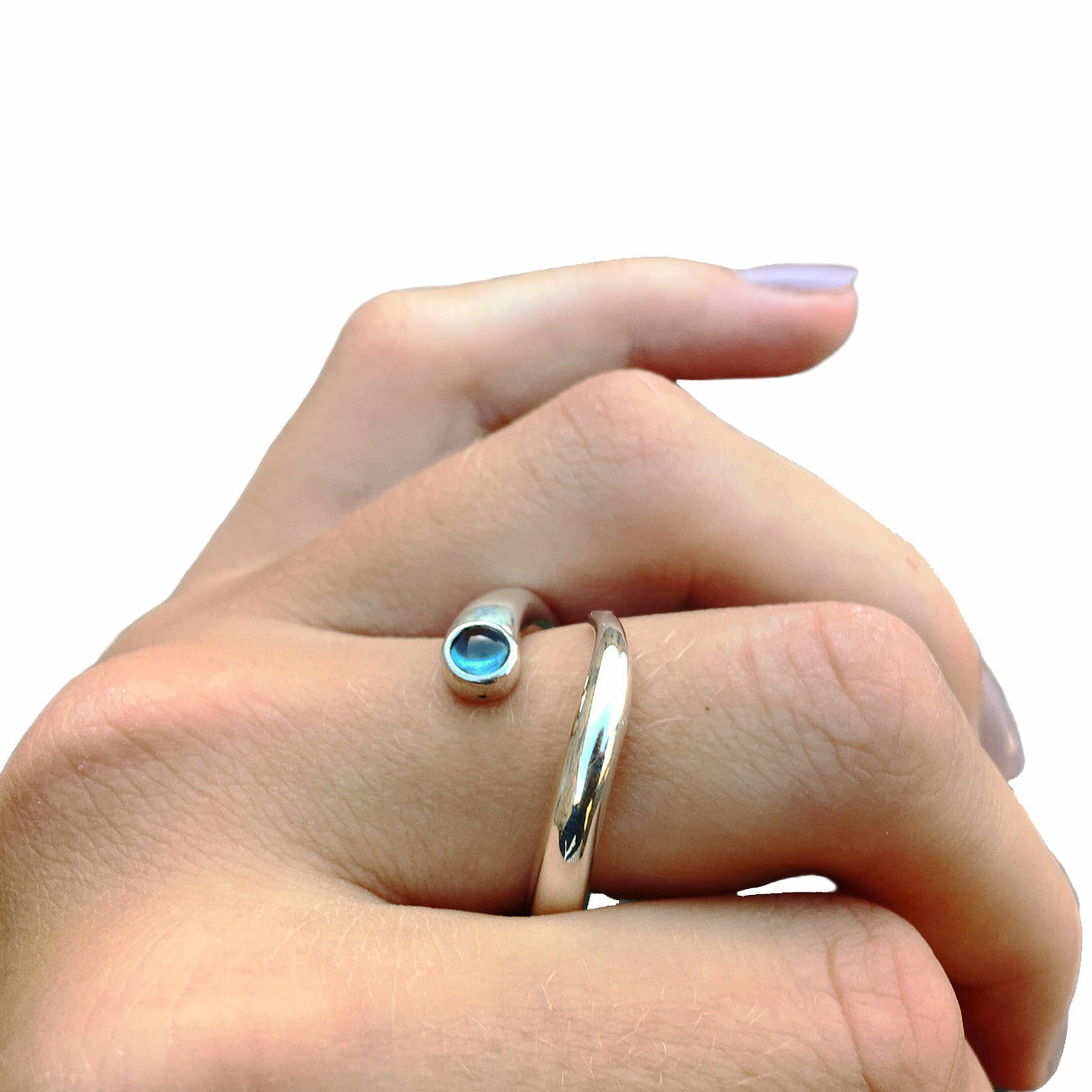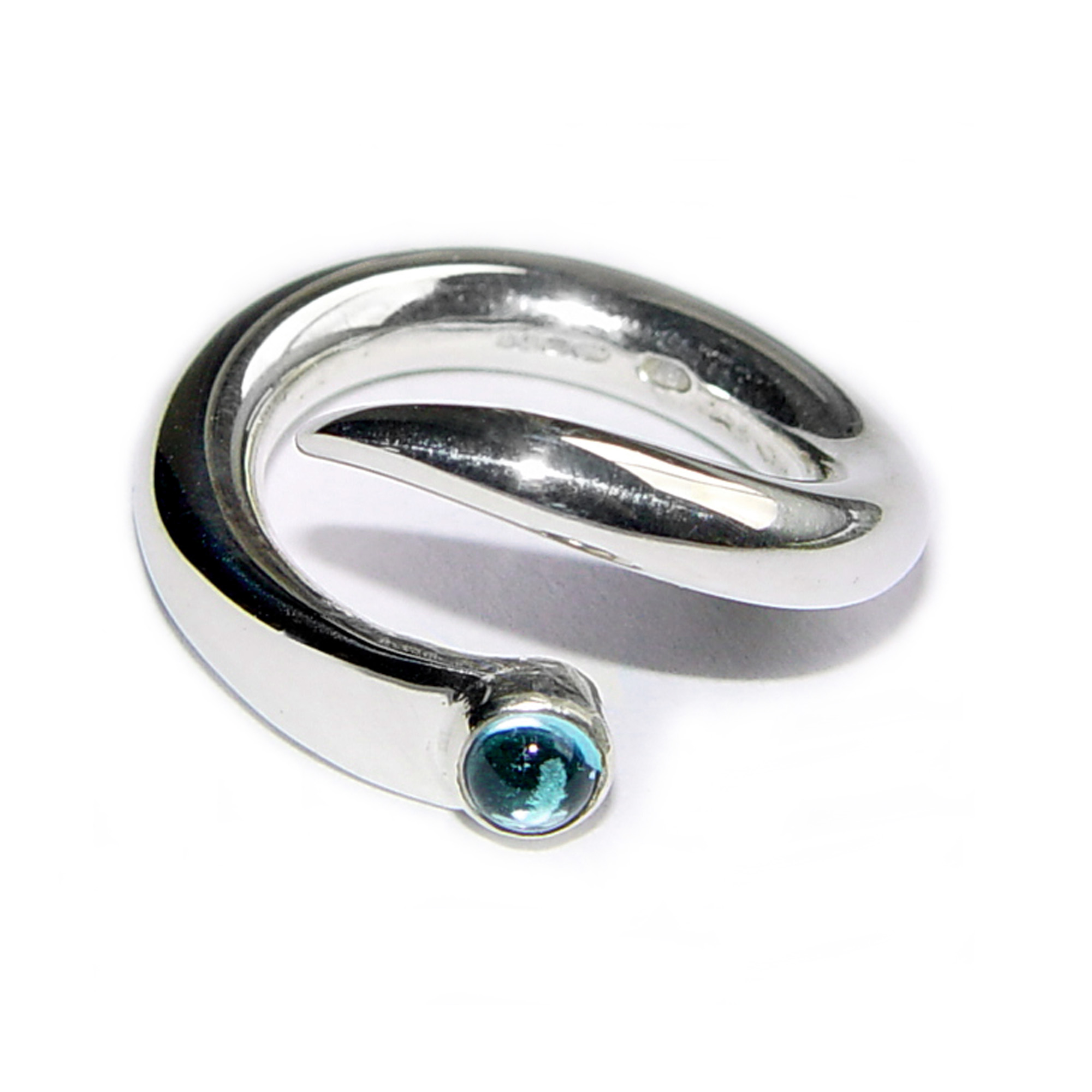Hand forged silver curving wiggly ring with blue topaz. The solid silver band tapers from 4mm and has a 3mm collet set cabochon blue topaz gemstone.