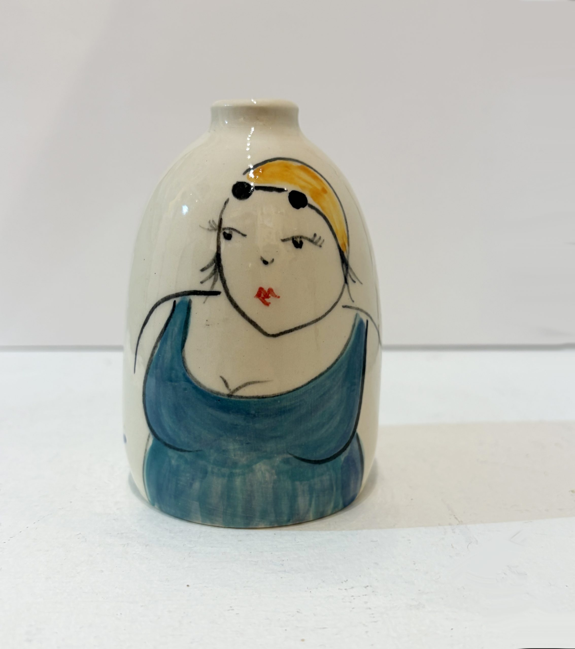 Wheel-thrown ceramic bud vase hand painted on the front with a vintage style illustration of lady in her swimming costume, swim cap and goggles. Individually decorated by Lucie in her Newlyn studio.
