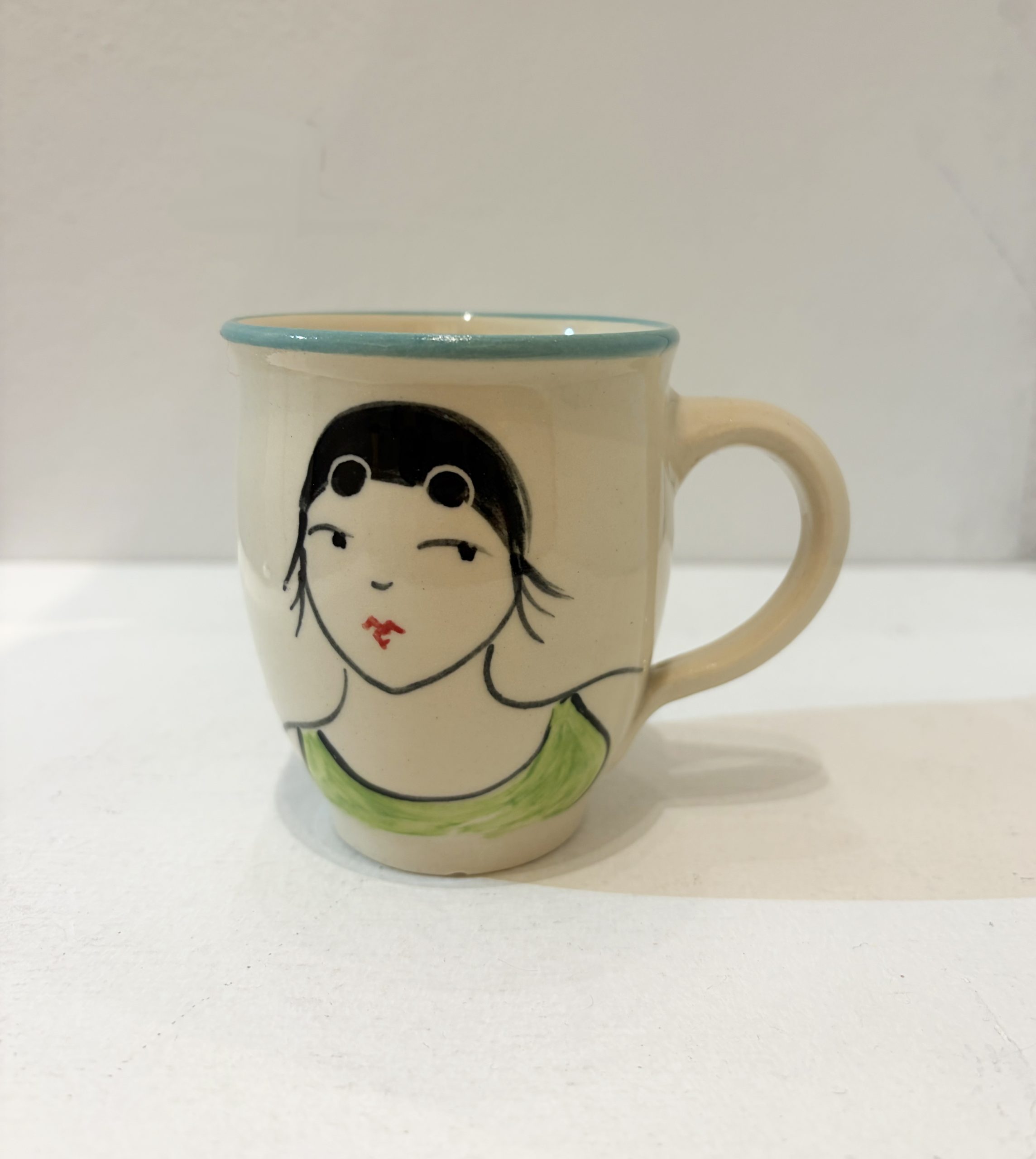 Wheel-thrown ceramic mug hand painted on the front with a vintage style illustration of lady in her swimming costume, swim cap and goggles. Individually decorated by Lucie in her Newlyn studio.