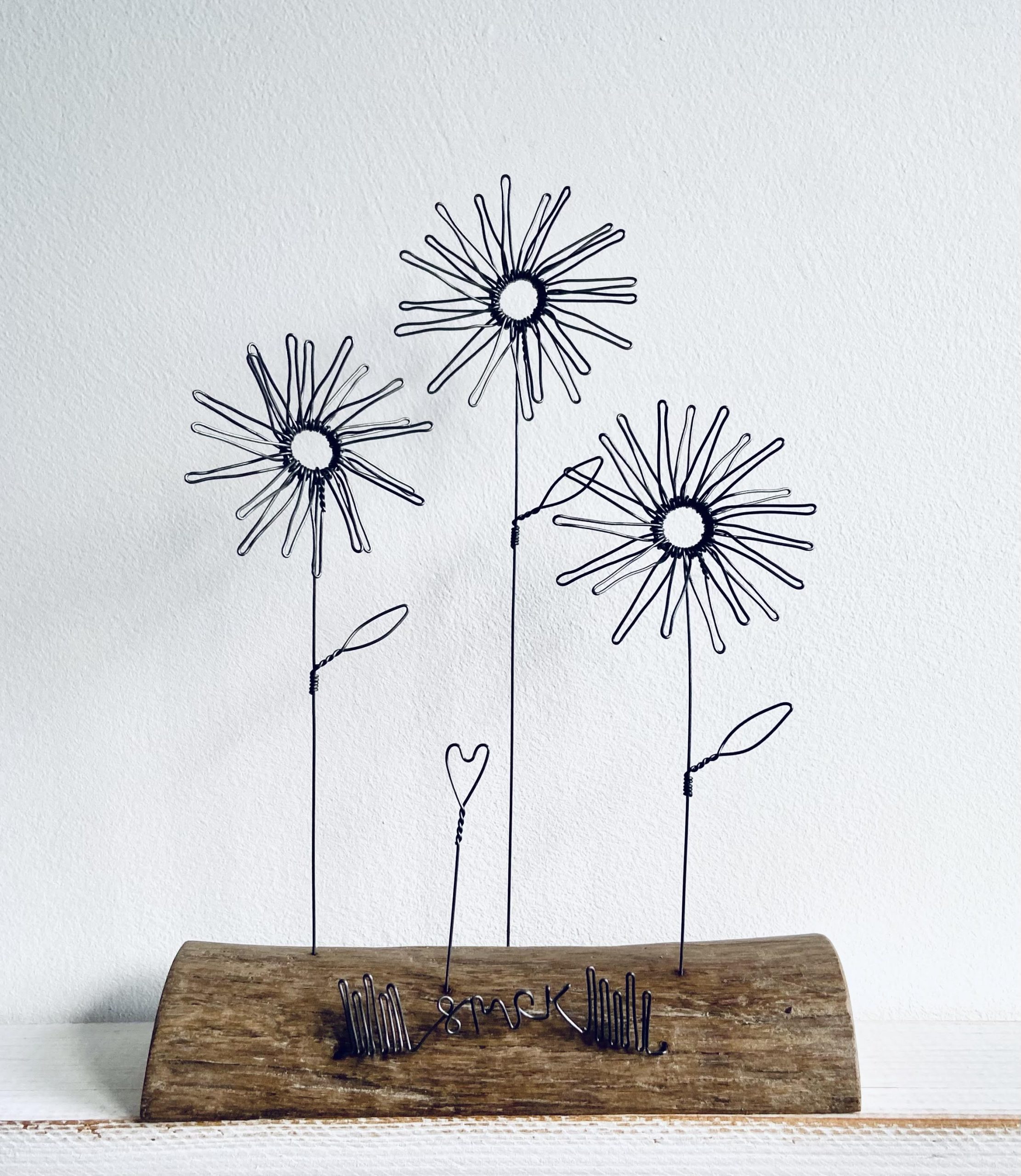 Three Asters formed from black annealed wire and a beautiful piece of driftwood. The driftwood has been waxed.
