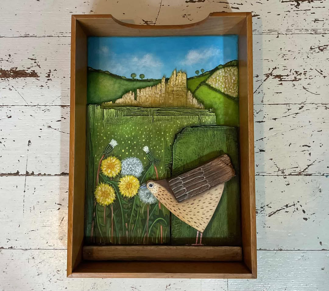 A whimsical framed 3-D wall-art depicting a thrush with dandelions in a springtime meadow landscape. Claire Brierley works from her studio in Stratford-upon-Avon and her imagery is informed by her joyous observation of the world around her and is inspired by nature, the countryside and the coast, using driftwood, recycled materials and found objects to create unique works of art hand-painted with bold bright acrylics.