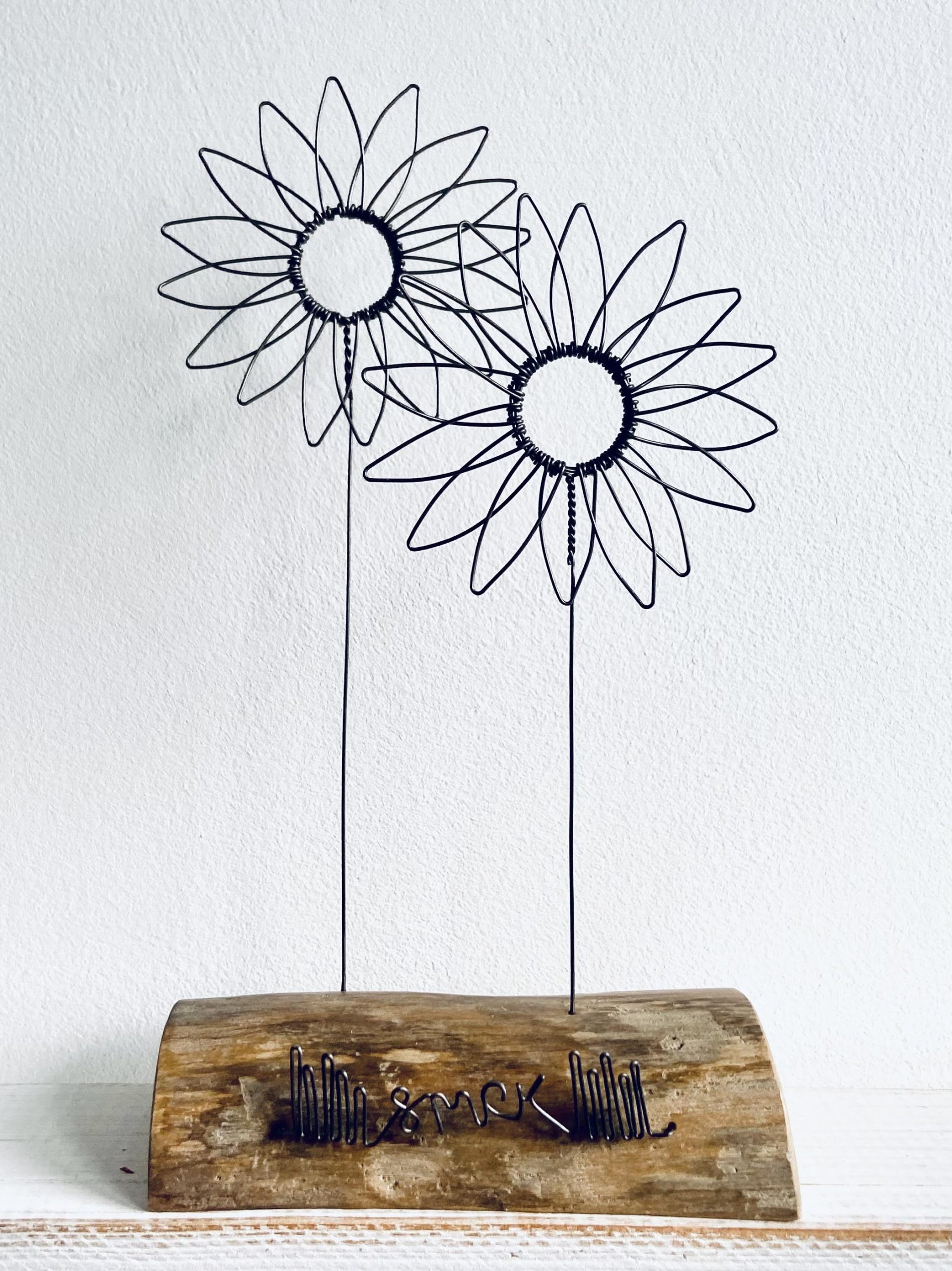 Two sunflowers formed black annealed wire and a beautiful piece of driftwood. The driftwood has been waxed.